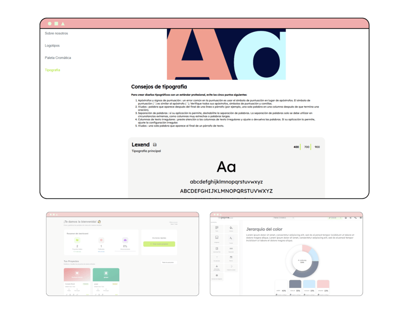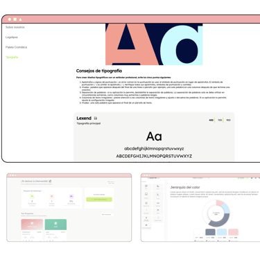 Añade automáticamente familias tipográficas, sus pesos y tamaños. Presenta la paleta con sus variantes y jerarquías. Todo sin maquetación manual en programas de diseño.